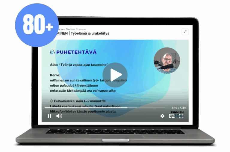 You have pre-recorded lectures with Virpi as your foundation (for grammar, phrases, listening & speaking practice). Then you practice with our super modern interactive learning platform and the ONNI course flashcards. Additionally, you can join the live sessions with Virpi for extra speaking practice (via Zoom).